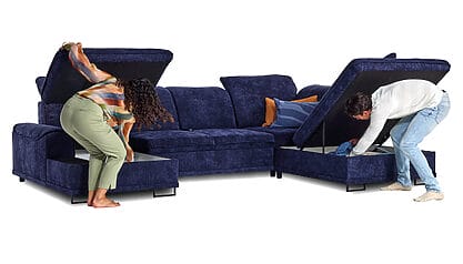 Bij deze U Salon zijn een slaapfunctie en opbergruimte optioneel. Overdag geniet u van een ruime zitbank, ’s nachts van een comfortabel slaapsofa. In de opbergruimte kunt u bijvoorbeeld dekens en kussens netjes opbergen.